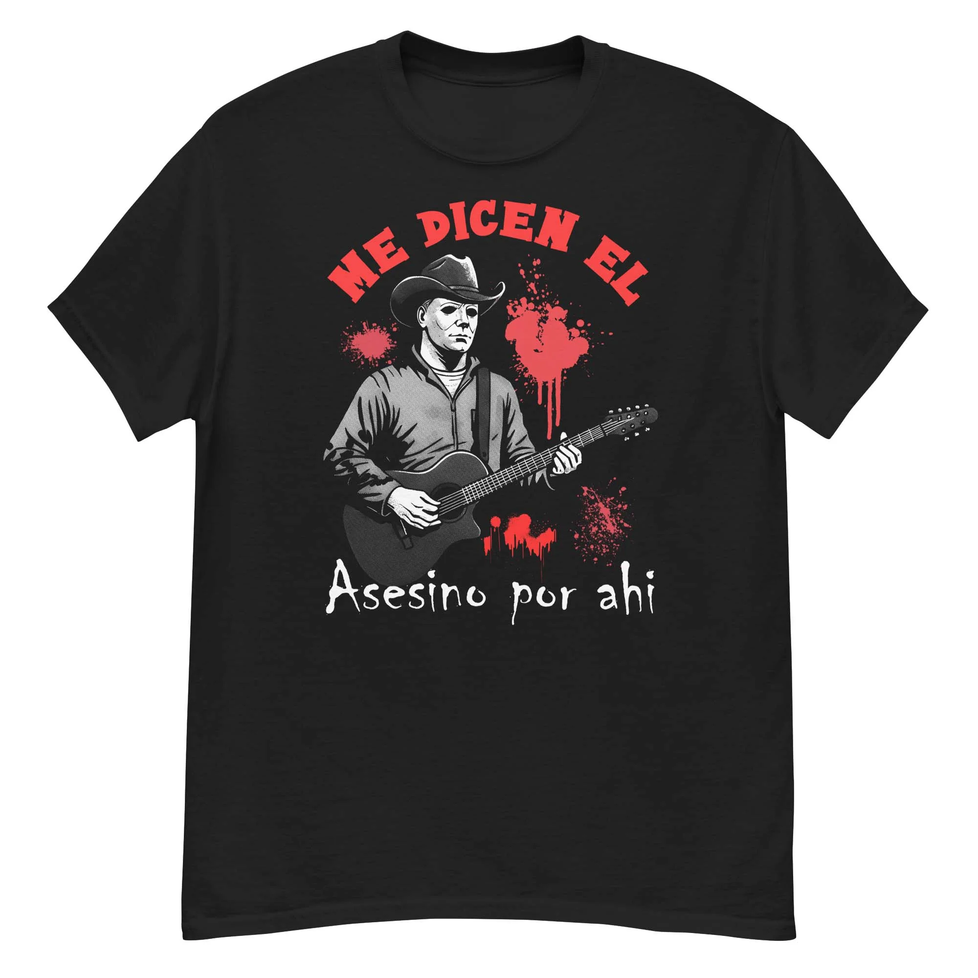 Playera negra para caballero con un divertido diseño del meme »Me dicen el asesino por ahi» representado por el villano de halloween con sombrero vaquero y tocando la guitarra, ideal para los que les gusta el humor negro